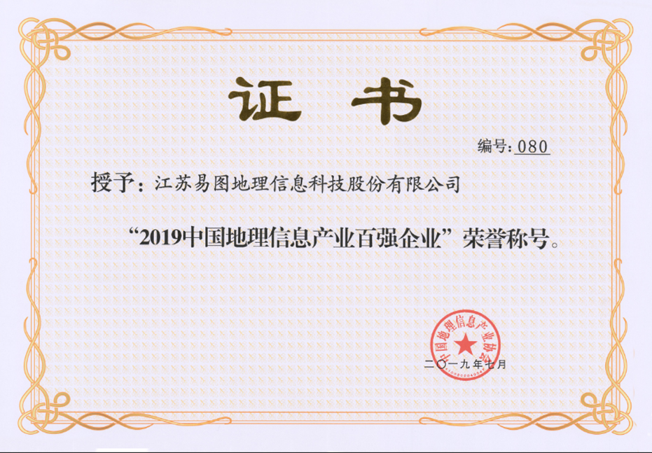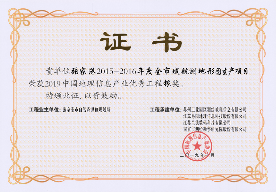 江苏易图地理信息科技股份有限公司凭借稳步增长的业绩和突出的人才技术实力,连续三年入围“中国地理信息产业百强企业”榜单。同时“扬州市生态科技新城农村建设用地调查项目”入围“2019中国地理信息产业优秀工程金奖”;“张家港2015-2016年度全市域航测地形图生产”项目荣获“2019中国地理信息产业优秀工程银奖”。