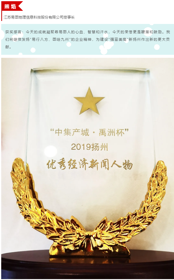 热烈祝贺我公司董事长熊焰同志获“ 2019 扬州优秀经济乐动ledong(中国)人物”殊荣。