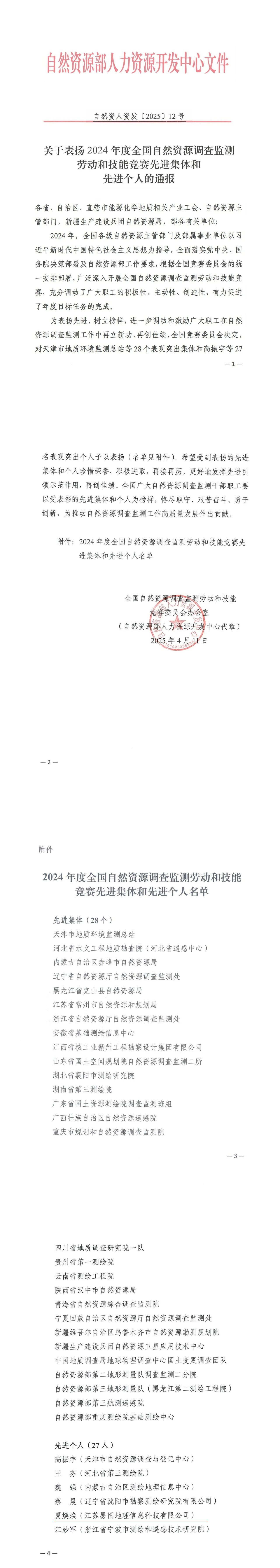 4月11日,自然资源部人力资源开发中心印发《关于表扬2024年度全国自然资源调查监测劳动和技能竞赛先进集体和先进个人的通报》,我司夏焕焕同志获评2024年度全国自然资源调查监测劳动和技能竞赛先进个人,展现了我司自然资源调查监测工作者的风采。