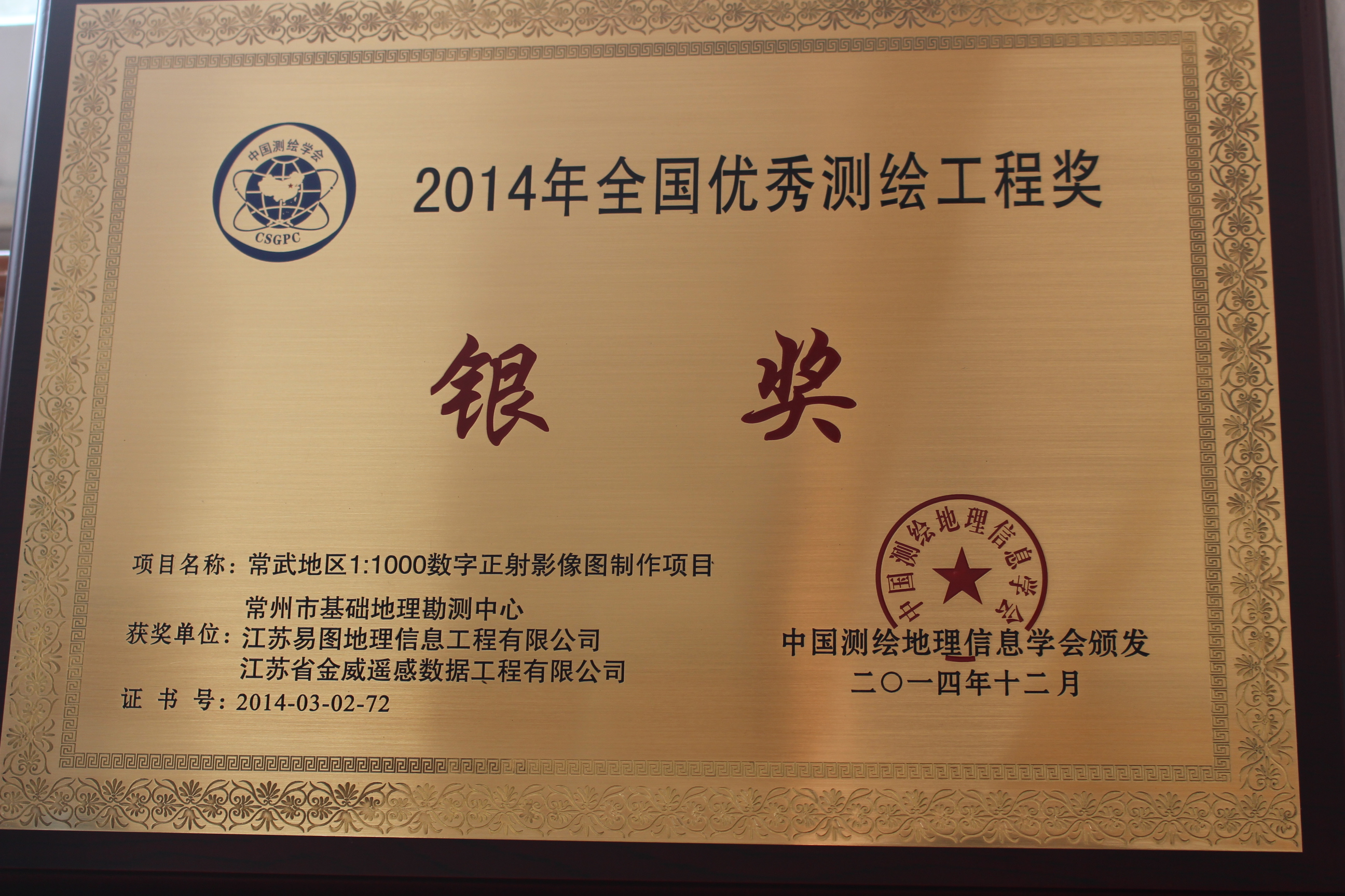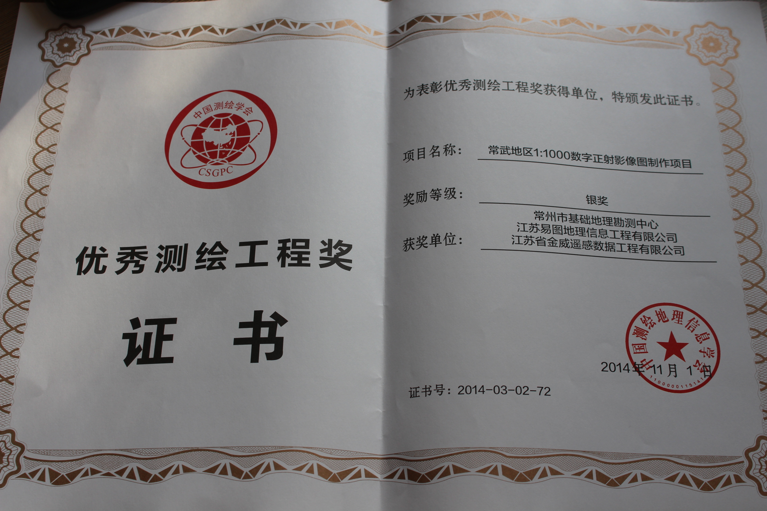 我公司荣获2014年全国优秀测绘工程奖
